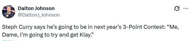 库里明年再次参赛,也算是把话题拉满,他还强调带上克莱,知道大家希望看到水花兄弟在三分大赛的舞台上再次较量一番。
