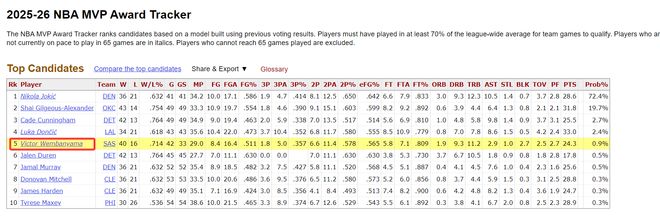 文班亚马更强悍的地方在于,马刺队是西部第二的豪强,这让文班亚马的MVP概率排在联盟第五,仅次于约基奇、亚历山大、坎宁安、东契奇。从这个角度来看文班亚马入选最佳一阵几乎是板上钉钉,只要文班亚马出战超过65场应该就是最佳阵容。